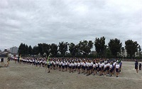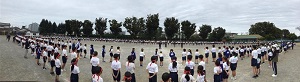 広い校庭での隊形練習で、それぞれがしっかりと位置や動きを確認していました。