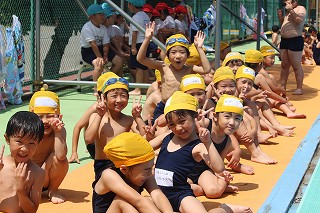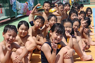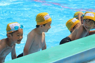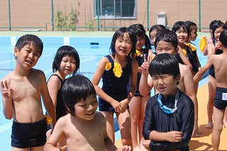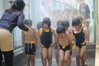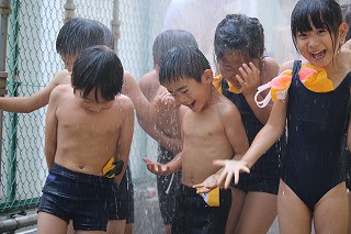 常盤小学校では、水泳の授業が始まっています。今日は、前時に着替えの練習をした一年生が、初めて小学校のプールにはいりました。最初はシャワーの冷たさに驚いていたもののプールに肩までしっかりとつかることができました。水に慣れるよう頑張りましょう。