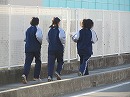 小学校の正門の脇を中学生が朝の部活動で走っています