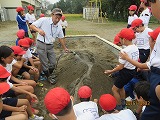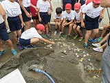 砂場に作った大きな砂山に水を流して実験し、