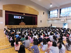 全校の児童に対し、校長先生から『絶対に飛び出してはいけない』