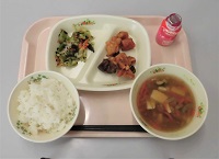 今日は6年4組のリクエスト給食です。給食でも人気のメニューが並んでいます。その中でもこんにゃくが入った上州サラダや、野菜たっぷりのスープなど、健康への関心が集まったメニューとなりました。