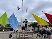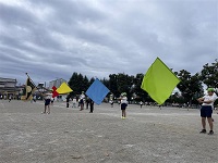 広い校庭での隊形練習で、それぞれがしっかりと位置や動きを確認していました。