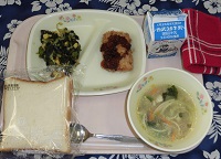 今日は、ハムカツです。厚切りハムに衣をつけて、一枚一枚丁寧に揚げました。サクッと食感もよいハムカツをパンにはさんでいただきました。スープスパゲティもスープ香りのが学校中に漂い、みんな給食の時間が待ち遠しかった様子です。