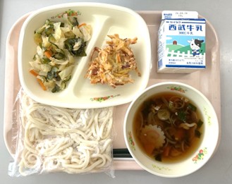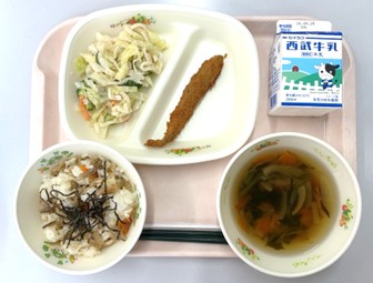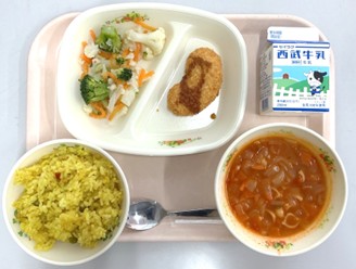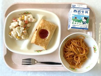 今年度最後の給食は、スパゲティナポリタンです。トマトの酸味でおいしくペロリンできますね。チキンの香草焼きも、バーブの風味で食が進みます。