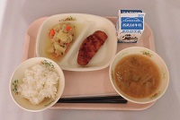 今日は冬野菜カレーです。れんこんとごぼうが入っています。サラダには大根が入っています。冬野菜にはビタミンCがたっぷりです。カゼ予防のためにもたくさん食べたいですね。大根は常盤小の学校農園で育てたものです。シャキシャキのサラダになりました。