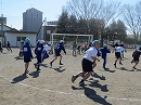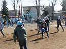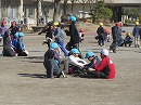 転倒のおそれのある遊具から離れ校庭で仲間とともに腰を下ろす子