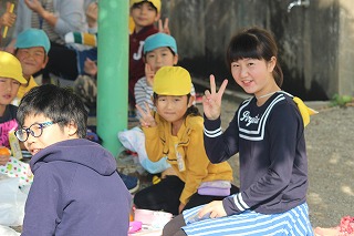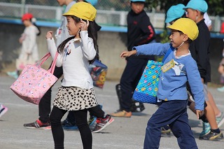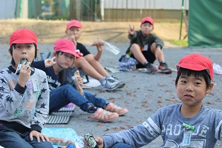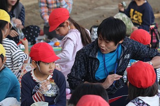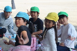 常盤小学校では、11月12日、天気のよい秋空のもと、縦割りのグループとなり、校庭で給食を食べました。心配していた雨も降らず、晴れて温かな日差しの中、児童は自分のお弁当箱に給食を入れて外で楽しそうに食事をし、その後も、縦割りのグループで色々な遊びをしました。