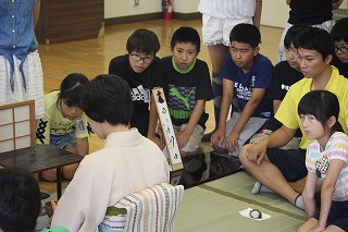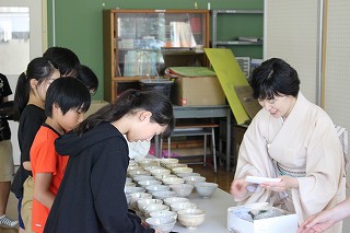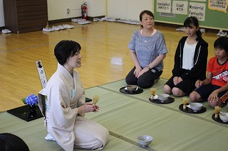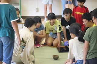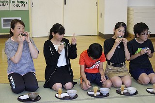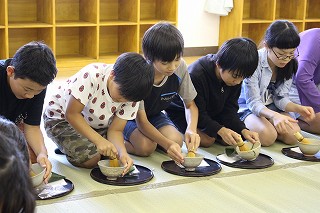 常盤小学校では六年生が、6月25日、地域の藤原先生をお招きしてスマイルルームで茶の湯の体験学習を行いました。スマイルルームにござを敷いてくださり、井草のにおいのする落ち着いた雰囲気で、児童は我が国の伝統文化にしっかりと触れることができました。ご多用の中、ご指導いただいた藤原先生には心から感謝いたします。