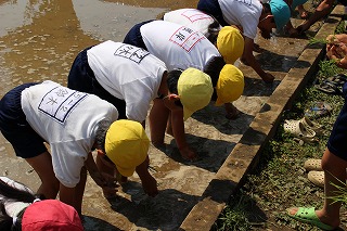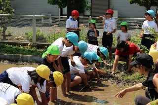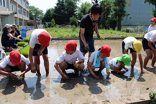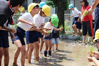 常盤小学校では、5年生が6月23日、敷地内の学校ファームで常盤幼稚園の園児と一緒に田植えを経験しました。梅雨の季節の晴れ間、毎日食べるお米は、農家の方のお仕事のお陰で家庭や学校に来ることを体験を通じ学びました。ご指導いただいたJA深谷の先生に心から御礼申し上げます。