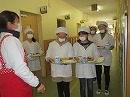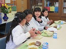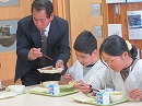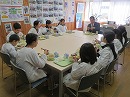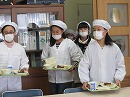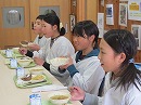 今年度最後の給食は、スパゲティナポリタンです。トマトの酸味でおいしくペロリンできますね。チキンの香草焼きも、バーブの風味で食が進みます。